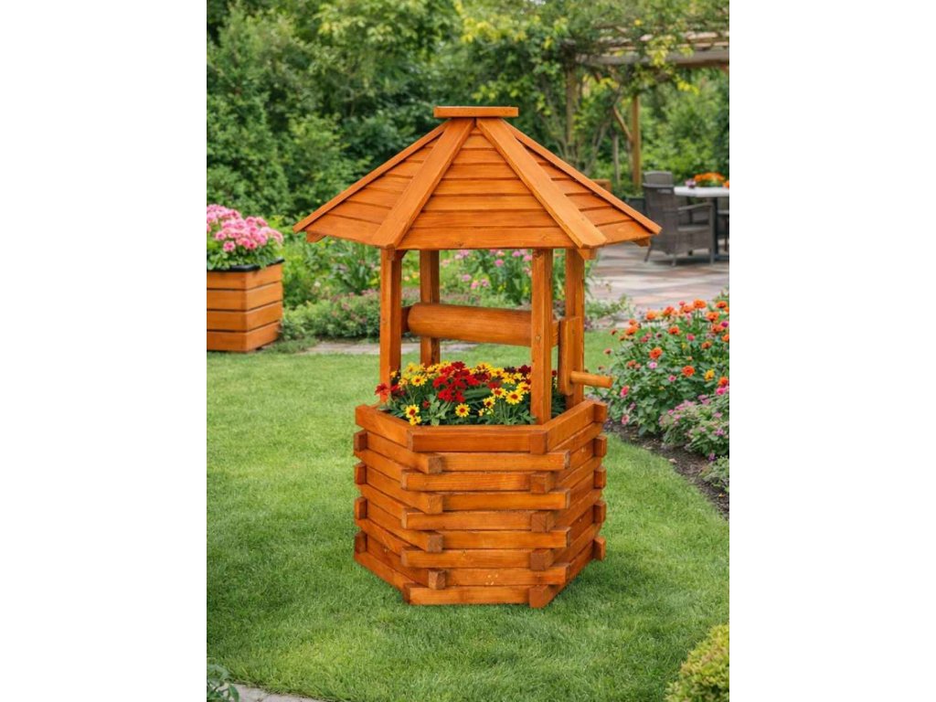 Dřevěná zahradní studna WIKI o výšce 130 cm je výrazná rustikální dekorace do zahrady, předzahrádky i ke květinové výsadbě.