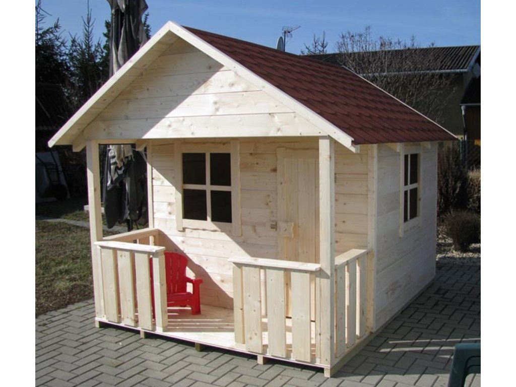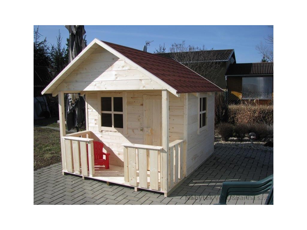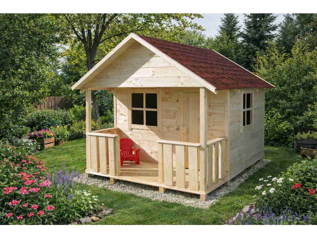 Díky prostornému půdorysu a kryté verandě vytváří ideální místo pro dětské hry, odpočinek i fantazii. Domek je dodáván v přírodním provedení, což umožňuje jeho další úpravu – nátěr, lazuru nebo barevné doladění dle vlastních představ.