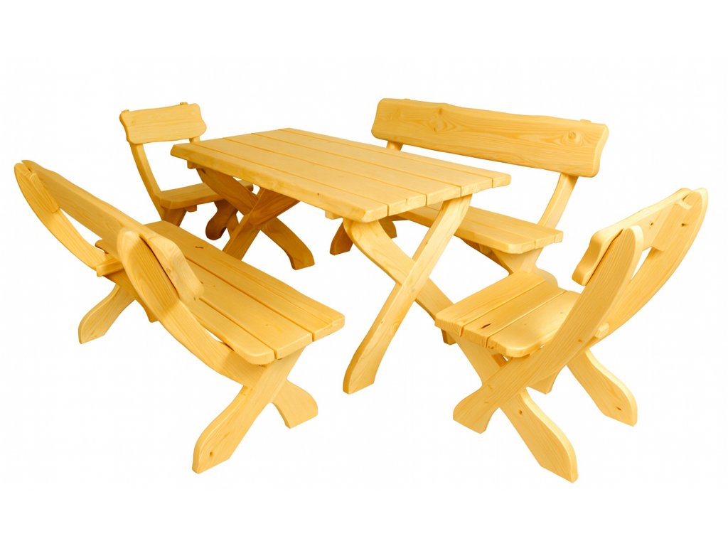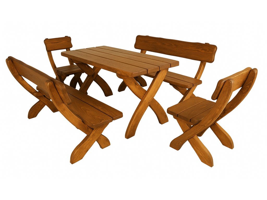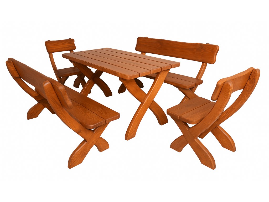 Zahradní nábytek je ideální volbou pro pohodlné venkovní posezení. Tento set zahrnuje dvě křesla o rozměrech 49 x 83 x 58 cm, dvě lavice o rozměrech 150 x 83 x 58 cm a jeden stůl o rozměrech 150 x 72 x 65 cm. Nábytek je vyroben z kvalitního jehličnatého dřeva a může být dodán bez povrchové úpravy nebo s povrchovou úpravou mořidlem s možností výběru odstínu.