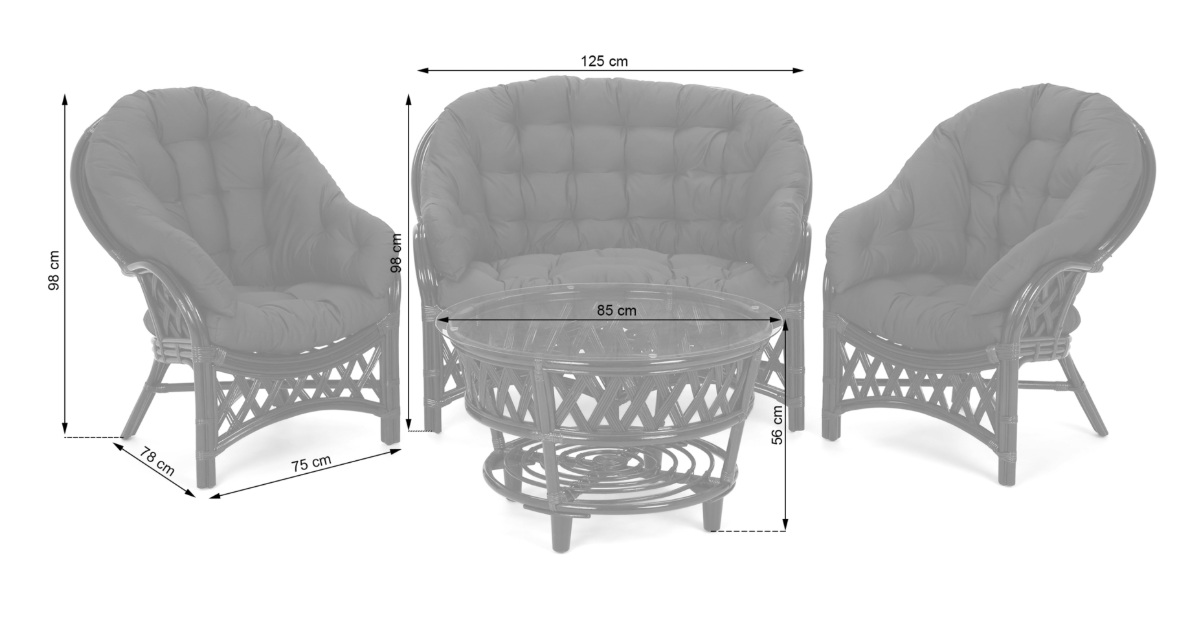 Souprava obsahuje dvoumístnou pohovku, dvě pohodlná křesla a kulatý konferenční stolek. Ergonomicky tvarované opěrky a zaoblené linie poskytují vysoký komfort při sezení. Silné měkké polštáře zajistí příjemné posezení při ranní kávě, odpočinku i setkání s rodinou nebo přáteli.