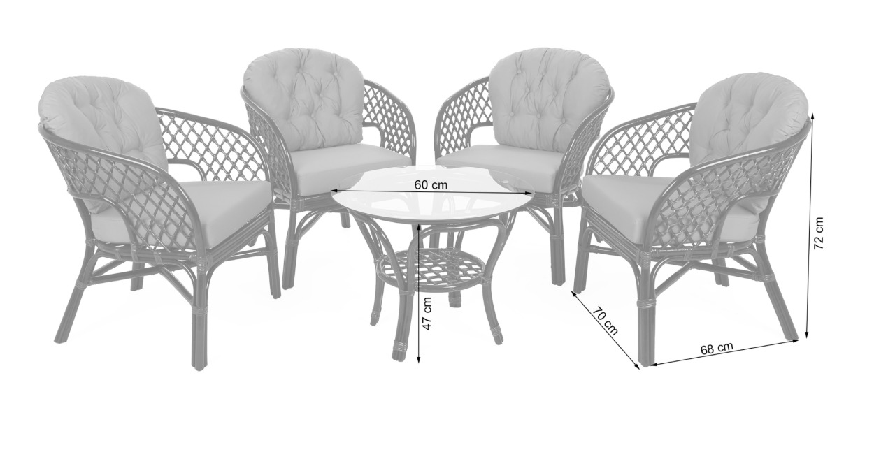 Souprava obsahuje čtyři pohodlná křesla s ergonomicky tvarovaným opěradlem a kulatý stolek se skleněnou deskou. Křesla jsou vybavena měkkými polštáři o tloušťce 8 cm, které zajišťují pohodlné sezení při ranní kávě, odpoledním relaxu i večerním posezení s přáteli. Polštáře mají praktické stuhy pro pevné uchycení ke konstrukci.