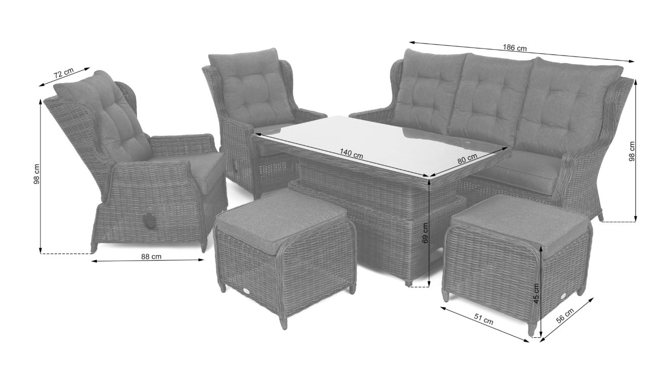 Sestava je určena až pro 7 osob a nabízí dostatek prostoru pro stolování i relaxaci. Součástí setu je prostorná trojmístná pohovka, dvě pohodlná křesla, dva taburety a velký jídelní stůl se skleněnou deskou. Vyšší stůl je ideální pro společné obědy, grilování nebo večerní posezení.