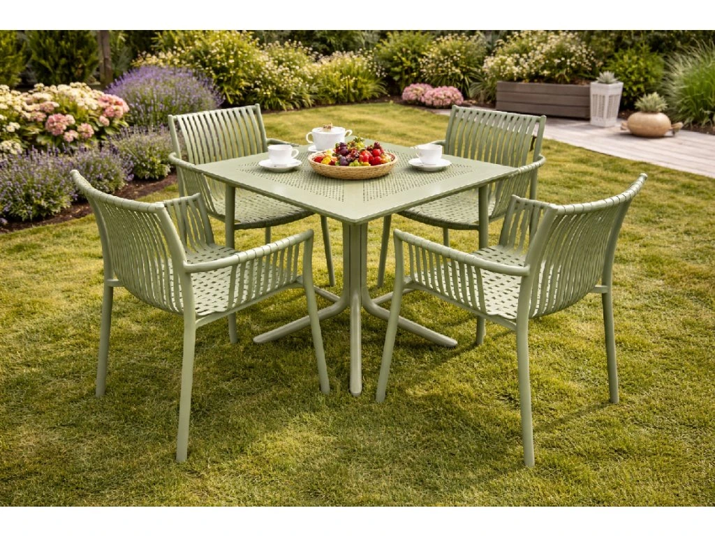 Součástí setu je čtvercový stůl o rozměrech 80 × 80 cm a 4 pohodlné židle s ergonomickým tvarem. Nábytek je vyroben z polypropylenu vyztuženého skelnými vlákny, což zajišťuje vysokou pevnost, dlouhou životnost a odolnost vůči UV záření, dešti i mechanickému opotřebení.